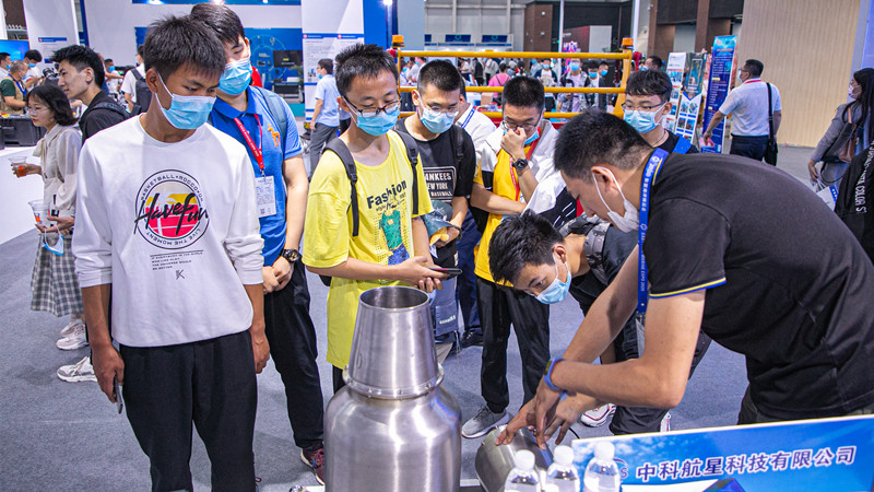 在中挪未來創(chuàng)新科技(青島)有限公司展區(qū),參觀者們正在通過視頻了解船體除銹機(jī)器人的工作過程?!八茏詣游皆诖w上,把生銹的大船清理的干干凈凈?!币晃恍∨笥迅嬖V記者。