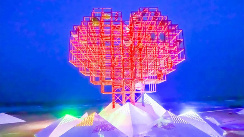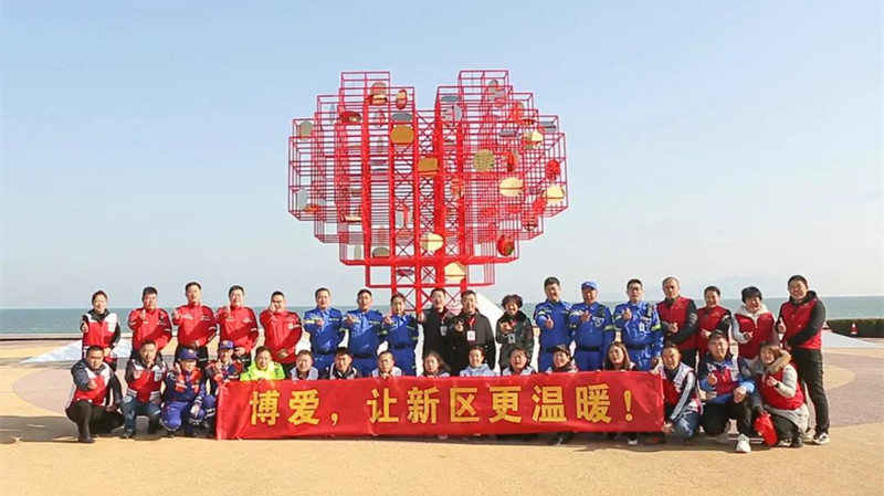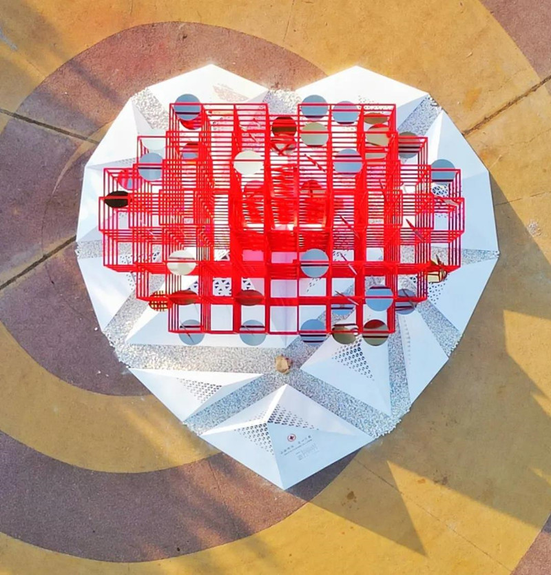 該雕塑位于城市陽(yáng)臺(tái)景區(qū)原海螺廣場(chǎng),距風(fēng)河入??诒卑都s400米,背靠會(huì)展公園,與靈山島隔海相望。采用動(dòng)態(tài)雕塑形式,主體結(jié)構(gòu)為愛心狀,內(nèi)部由一片片可以風(fēng)動(dòng)的鏡面不銹鋼組成,猶如多顆“愛心”爭(zhēng)相簇?fù)?;從空中俯瞰,亦成“心”形,寓意“愛心匯聚”。側(cè)面呈紅十字狀,底座呈山形,與風(fēng)河、大海相呼應(yīng),象征“山海情深”。作品整體與環(huán)境相融,實(shí)現(xiàn)“山海情深、愛心匯聚”的詩(shī)意表達(dá),與紅十字“人道、博愛、奉獻(xiàn)”精神完美契合,展現(xiàn)了新區(qū)人民熱心公益、崇德向善的社會(huì)風(fēng)尚和勇立潮頭、積極向上的精神風(fēng)貌。