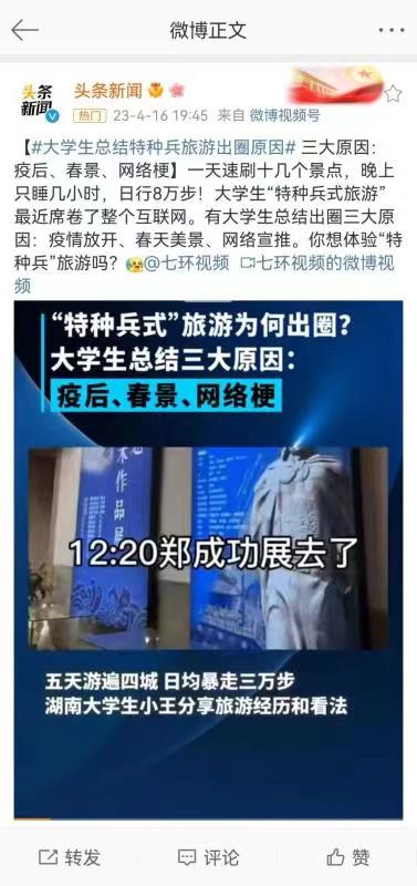 那究竟什么是“特種兵式旅游”?是指人們利用周末時(shí)間旅游,短時(shí)間、高效率逛景區(qū),甚至犧牲睡覺時(shí)間,一分鐘都不耽擱,主打的就是一個(gè)“去過”。越來越多的年輕人加入了“特種兵式旅游”的行列,成為了這一旅游趨勢中的重要力量。