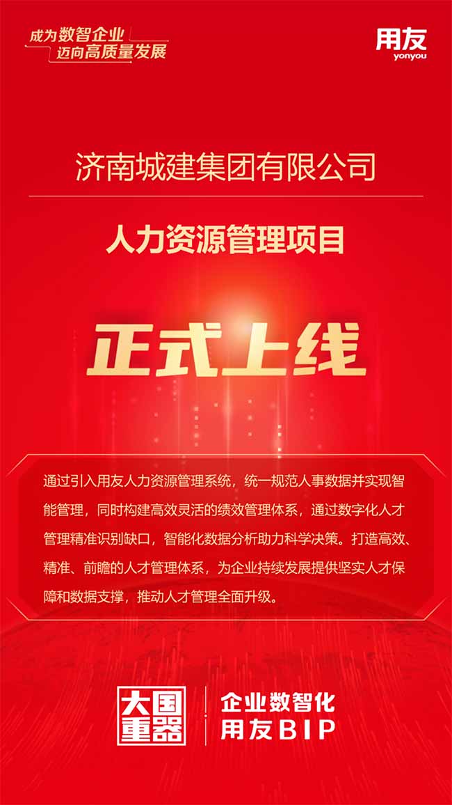在企業(yè)高速發(fā)展的背景下,濟南城建集團為升級人才管理、降低管理成本、提升管理效率,經(jīng)多方考慮決定攜手用友建筑搭建人力資源系統(tǒng)。在其項目組的緊密協(xié)作下,短短30天內(nèi)成功完成系統(tǒng)上線,實現(xiàn)了集團層人力資源管理的全面升級。此次升級不僅充分展現(xiàn)了用友的專業(yè)實力與高效執(zhí)行力,更為濟南城建集團帶來了管理上的革新與突破,推動集團在人力資源管理方面實現(xiàn)四大成效: