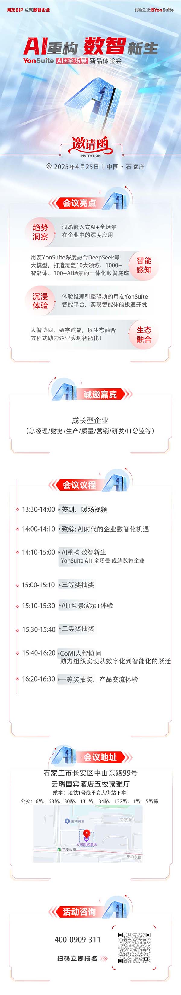 免費(fèi)AI盛宴,智啟未來(lái)!4.25日云瑞國(guó)賓酒店-河北鴻圖YonSuite峰會(huì)免費(fèi)邀約
