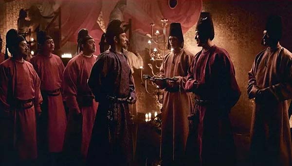 李善德要跑通各個衙門要錢要人要馬匹時,就像一個大廠員工為了完成項目,跑財務、人力、技術、市場等部門,各個部門把鍋甩得滿天飛,他只能仰頭長嘆,不知道從何理起這團亂麻。電影里也將大唐朝堂幾乎拍成了一個大廠員工跑寫字樓的構圖和視覺效果,上上下下,見了各種嘴臉,李善德站在一個圓圈的中間愁眉苦臉。閉環(huán)的意思,原來是讓人無路可走。