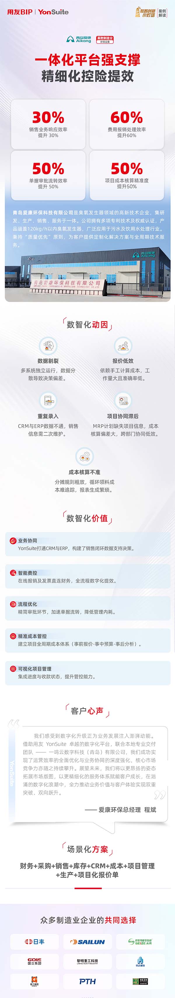 “臭氧發(fā)生器的核心是‘精準’—— 精準的臭氧濃度、精準的反應(yīng)時間,才能保證水質(zhì)安全。企業(yè)管理也是如此,只有精準的成本管控、高效的協(xié)同效率,才能支撐企業(yè)持續(xù)發(fā)展。” 愛康環(huán)??偨?jīng)理程斌在談及轉(zhuǎn)型時感慨道,“YonSuite 為我們注入了‘精準基因’,讓成本可量化、流程可追蹤、決策有依據(jù)。未來,我們將以更精細化的管理和更可靠的產(chǎn)品,讓每一臺臭氧發(fā)生器都成為客戶信賴的‘水質(zhì)衛(wèi)士’。”