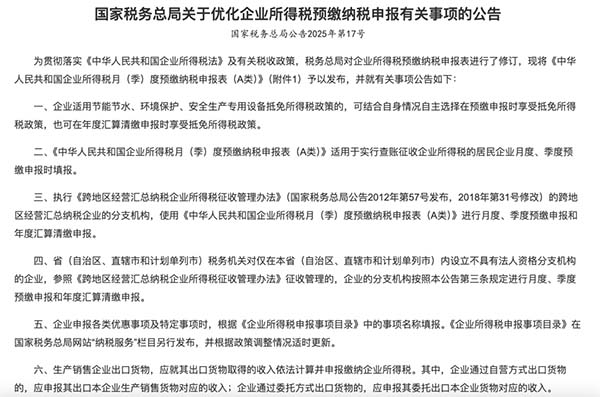 近期,國(guó)家稅務(wù)總局發(fā)布的《關(guān)于優(yōu)化企業(yè)所得稅預(yù)繳納稅申報(bào)有關(guān)事項(xiàng)的公告》(國(guó)家稅務(wù)總局公告 2025 年第 17 號(hào)),則為小微企業(yè)帶來了諸多利好。