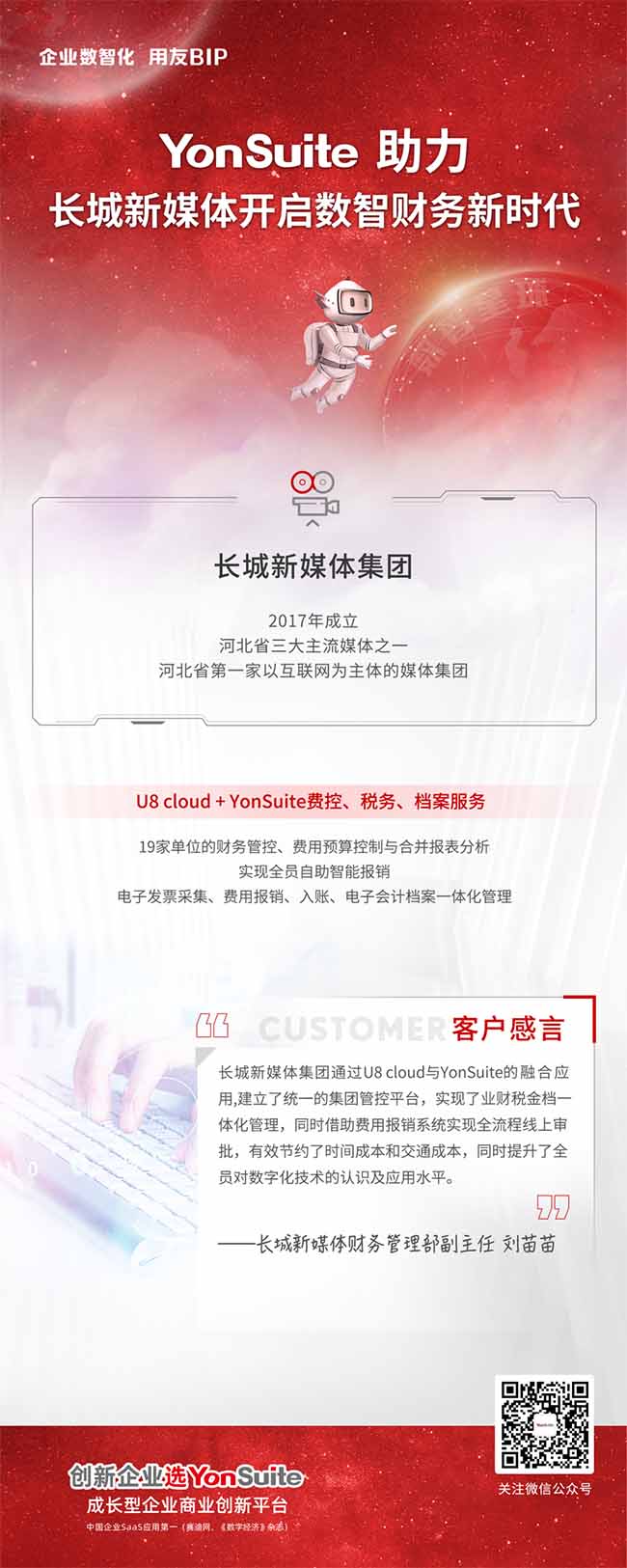 長(zhǎng)城新媒體集團(tuán)是一家新型多媒體信息服務(wù)公司,企業(yè)信息化建設(shè)意識(shí)超前,一直以來以財(cái)務(wù)牽頭逐步推動(dòng)公司內(nèi)部管理信息化建設(shè)。本次采用用友 U8 cloud+YonSuite 費(fèi)控、稅務(wù)、檔案服務(wù)利用云 + 端產(chǎn)品優(yōu)勢(shì),借助河北省推動(dòng)電子會(huì)計(jì)檔案試點(diǎn)單位建設(shè)的契機(jī),以用友產(chǎn)品多組織集團(tuán)財(cái)務(wù)管控平臺(tái)和 YonSuite 費(fèi)用全員報(bào)銷、電子發(fā)票自動(dòng)查重驗(yàn)偽、智能填單、一鍵歸檔的產(chǎn)品特點(diǎn)助力長(zhǎng)城新媒體集團(tuán)數(shù)值化轉(zhuǎn)型邁上了新的臺(tái)階。