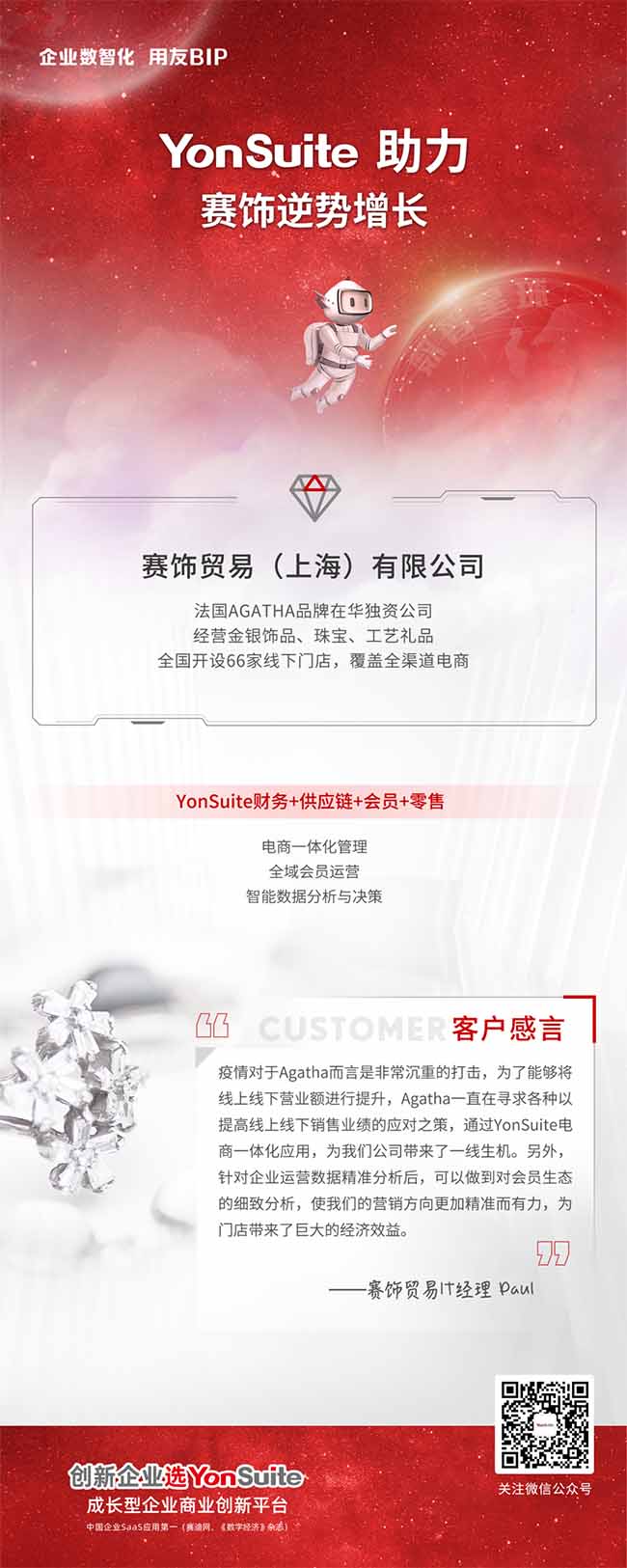 Agatha 想要盡快恢復(fù)門店業(yè)績,需要盡快升級(jí)傳統(tǒng)的營銷模式,轉(zhuǎn)為以“數(shù)據(jù)”為主導(dǎo)的數(shù)字化運(yùn)營模式,通過 用友YonSuite 會(huì)員精細(xì)化運(yùn)營,針對不同顧客進(jìn)行針對性營銷,提升營銷效率。他們從與 YonSuite 攜手過程中探索出門店智慧運(yùn)營的管理新模式,化解了企業(yè)危機(jī)。