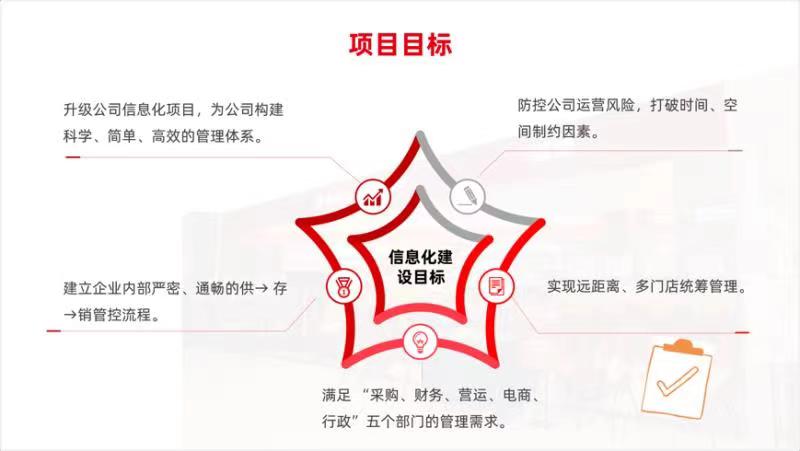 在這樣的窘境下,付國(guó)銀對(duì)企業(yè)數(shù)智化需求重新進(jìn)行了梳理和盤點(diǎn),并制定了五大建設(shè)目標(biāo),即通過(guò)數(shù)智化平臺(tái)的建設(shè),滿足采購(gòu)、財(cái)務(wù)、電商、行政等部門管理訴求;規(guī)范業(yè)務(wù)管理,建立標(biāo)準(zhǔn)化、一體化的供、存、銷管理流程;實(shí)現(xiàn)對(duì)所有門店的集中管控;加強(qiáng)移動(dòng)化應(yīng)用,打造全面高效的決策支持體系,提高管理者的決策效率和準(zhǔn)確率;為企業(yè)構(gòu)建科學(xué)、有效的管理體系。