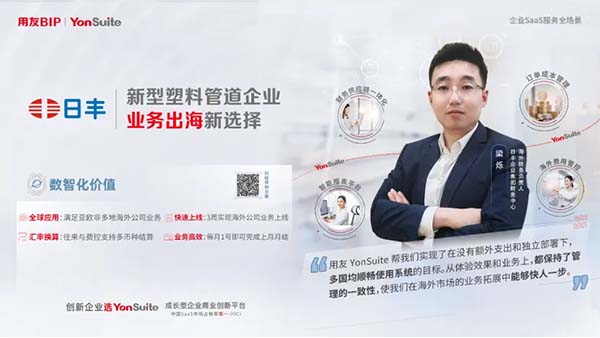 日豐集團(tuán)自1996年成立以來,在管道產(chǎn)品領(lǐng)域深耕二十余載,為億萬家庭提供全屋管道系統(tǒng)解決方案。隨著品牌走向國(guó)際,其在海外業(yè)務(wù)運(yùn)營(yíng)協(xié)同和管理上面臨諸多挑戰(zhàn)。在此背景下,日豐選擇用友YonSuite作為海外拓展的數(shù)智化伙伴,取得了顯著成效:實(shí)現(xiàn)了更高效管理,極大提升了財(cái)務(wù)的工作效率和全球的協(xié)同效率,有力推動(dòng)企業(yè)在全球業(yè)務(wù)的拓展。