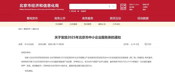 為進(jìn)一步降低中小企業(yè)創(chuàng)新發(fā)展成本,滿足日益增長(zhǎng)的服務(wù)需求,北京市經(jīng)濟(jì)和信息化局近日宣布補(bǔ)充2025年度北京市中小企業(yè)服務(wù)券供給額度,服務(wù)券將持續(xù)發(fā)放至9月份。