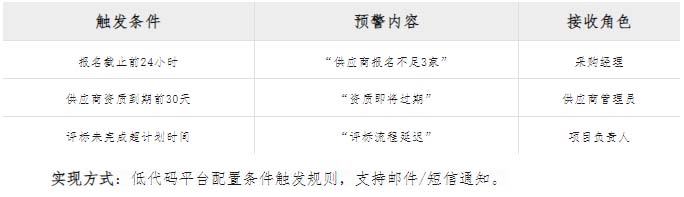 IF 投標(biāo)截止時(shí)間 < NOW() AND 投標(biāo)數(shù) < 3 THEN 發(fā)送預(yù)警