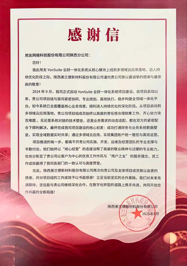 在陜西這片千年秦韻與現(xiàn)代科創(chuàng)交相輝映的熱土上,制造業(yè)的數(shù)智化轉型浪潮奔涌向前。陜西美蘭德新材料股份有限公司,作為國內(nèi)炭/炭復合材料領域的領軍企業(yè),在與用友網(wǎng)絡科技股份有限公司陜西分公司的長期合作中,始終以深度信任為基礎,堅持“整體規(guī)劃、分步實施”策略,穩(wěn)步推進數(shù)智化轉型。雙方以用友YonSuite全鏈路云服務為支撐,攜手打造一體化數(shù)智平臺,實現(xiàn)了業(yè)財深度融合與高效協(xié)同管理,為陜西制造業(yè)的轉型升級提供了可借鑒的實踐路徑。