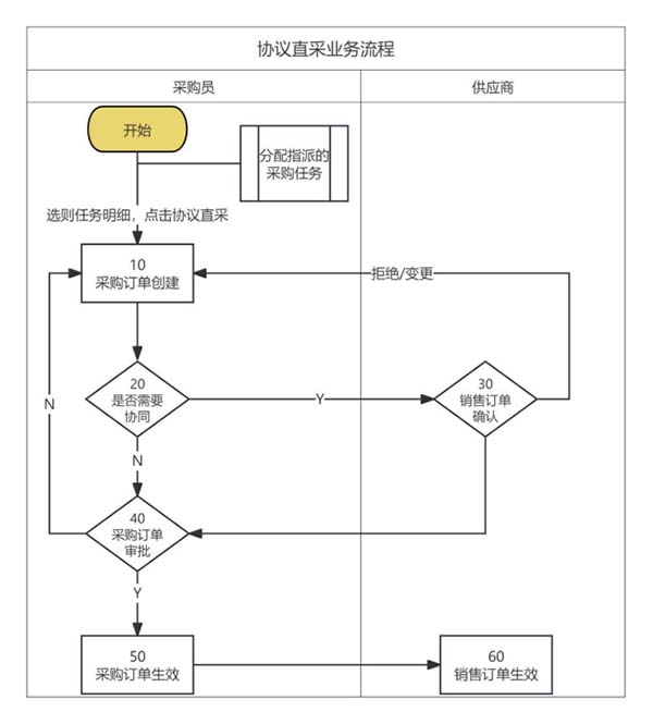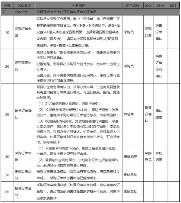 采購后員接到采購任務(wù),針對前期簽訂了采購框架協(xié)議合同的物料,無需去做采購詢價,勾選采購任務(wù)里的物料匹配到簽訂的框架協(xié)議合同(未到協(xié)議終止日期的采購框架協(xié)議)匹配價格,確定本次采購量和期望到貨日期生成采購訂單,發(fā)布協(xié)同給到供應(yīng)商。供應(yīng)商查看并確認訂單,自動形成銷售訂單,供應(yīng)商根據(jù)訂單完成貨物交付發(fā)票開具,采購方完成貨物的簽收和入庫和款項支付后續(xù)業(yè)務(wù)。
